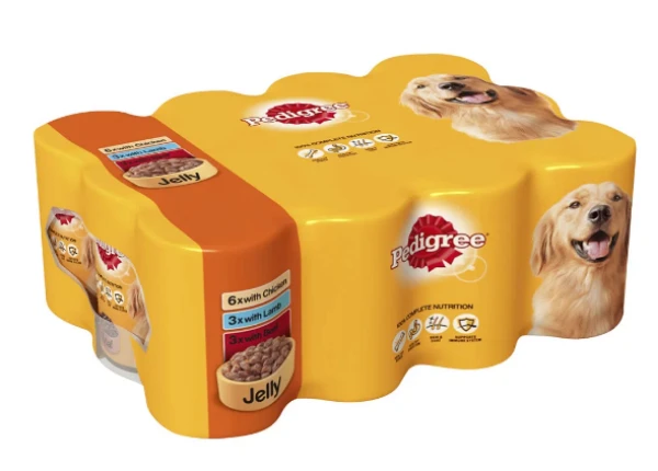 Pedigree Dog Tins Mixed Selection in Jelly 12 x 385g has been developed with vets to give dogs 100% complete nutrition. The mixed selection of dog food in jelly comes in 3 meaty flavours: Lamb, Chicken and Beef. The wet dog food contains 4 times less calories gram for gram than the average dry dog food to help healthy weight maintenance. Contents: 6x with Chicken, 3x with Lamb, 3x with Beef.Complete pet food for adult dogs.